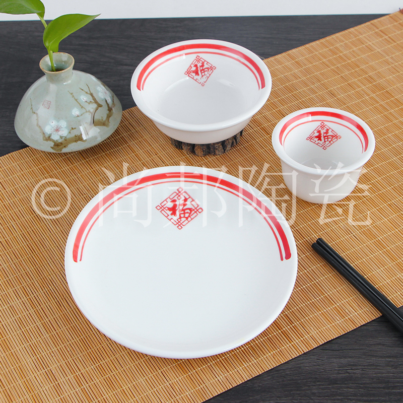 尚邦陶瓷可根据客户所需进行私人订制消毒餐具套装,如这款红色福字餐具,在每一个餐具上面印有半条红线,一个福字,表示福到家了!